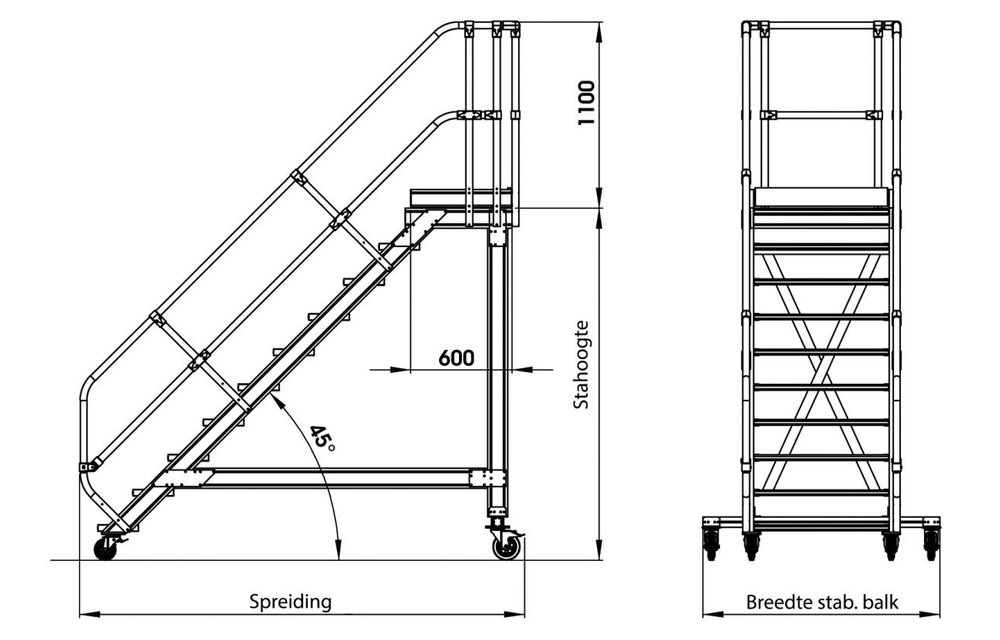 Het ruime platform is 460 mm lang. De bovenste trede (225 mm) ligt op dezelfde hoogte als het platform. Hierdoor is de totale platformlengte 685 mm. Er is keuze uit platformen met een breedte van 600, 800 en 1.000 mm.